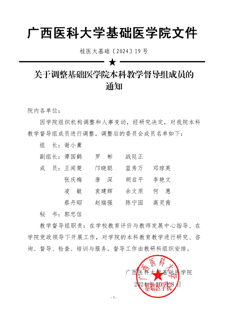关于调整基础医学院本科教学督导组成员的通知