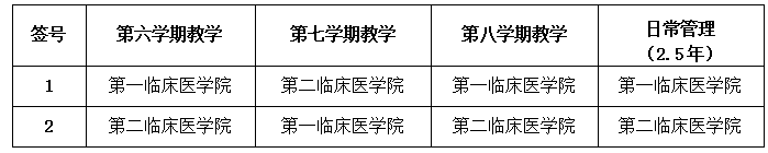 例如:抽到1号签的班级第六学期在第一临床医学院上课;第七学期在第二临床医学院上课;第八学期在第一临床医学院上课;由第一临床医学院负责第六、第七、第八3个学期以及实习和毕业的日常管理。