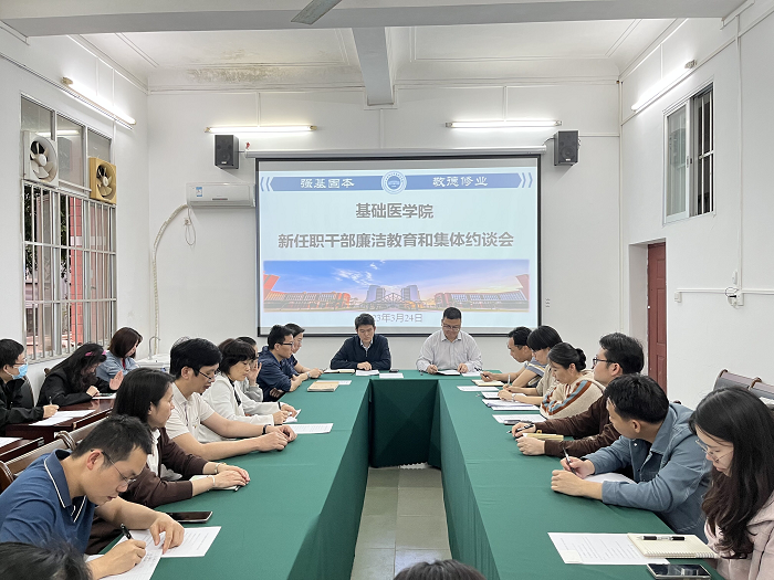 3月24日下午,基础医学院在103馆207会议室召开新任职干部廉洁教育专题会议,党委书记谭机永,党委副书记、纪委书记李文奇,新一届教工党支部书记、支委以及新任职科室主任等30余人参加会议。