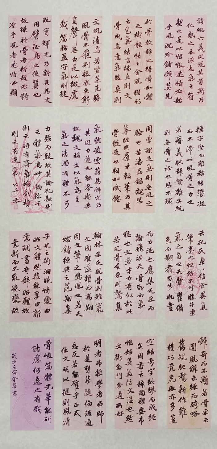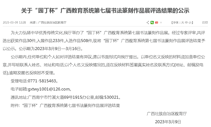 近日,由广西壮族自治区教育厅举办的“园丁杯”广西教育系统第七届书法篆刻作品展评选结果公布,基础医学院2020级临床医学8班莫金蓓同学的作品《右录文心雕龙风骨篇》在大学非专业组的评选中获奖,是8x8x视频 唯一入选并获奖的作品。据悉,此次评选共评出获奖作品30件,入展作品233件,入选作品508件,其中在大学非专业组中,共评出获奖作品5件,入展作品28件,入选作品43件。