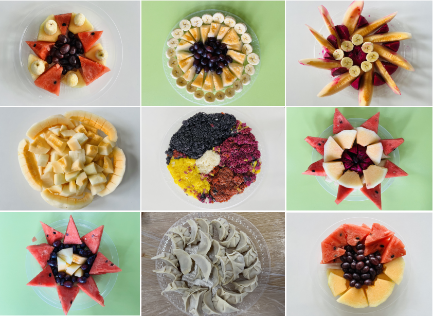 同学们制作的一朵朵“民族之花”(水果拼盘、五色糯米饭、饺子)