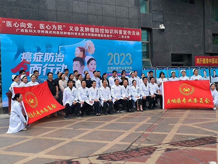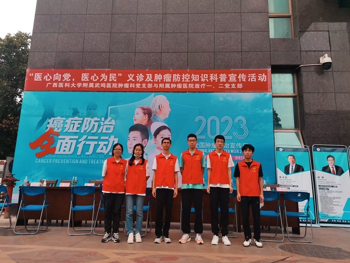 为深入贯彻落实党的二十大精神,高质量推动健康中国癌症防治专项行动,4月14日,广西医科大学附属肿瘤医院放疗科联合广西医科大学附属武鸣医院肿瘤科共同举办以“践行健康中国战略,助力肿瘤科学防控”为主题的公益活动,广西医科大学基础医学院团委“医心医意”志愿活动中心协助其开展宣传教育工作。