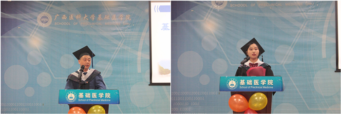 研究生导师代表、国家级高层次人才计划获得者谢小薰教授、青年教师代表崔兰玉老师分别为毕业生送上寄语和祝福。2023届研究生毕业生代表李建涛同学和本科毕业生代表梁宝月同学依次上台发言,表达对母校、老师、父母、同学们的感恩之情,并决心秉承“厚德励志、博学弘医”的校训和“强基固本、敬德修业”的院训,踔厉奋发,勇毅前行,努力成为社会有用之才。