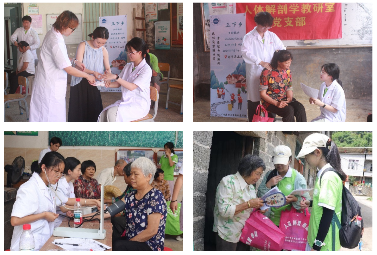 为响应国家“健康中国”战略和乡村振兴战略号召,引导医学生在实践中锤炼专业技能、厚植家国情怀。2025年7月7日至7月10日,基础医学院团委学生会联合教育部首批“全国高校黄大年式教师团队”人体解剖与组织胚胎学教师团队代表组成乡村振兴实践团赴南宁市马山县开展暑期“三下乡”社会实践活动。