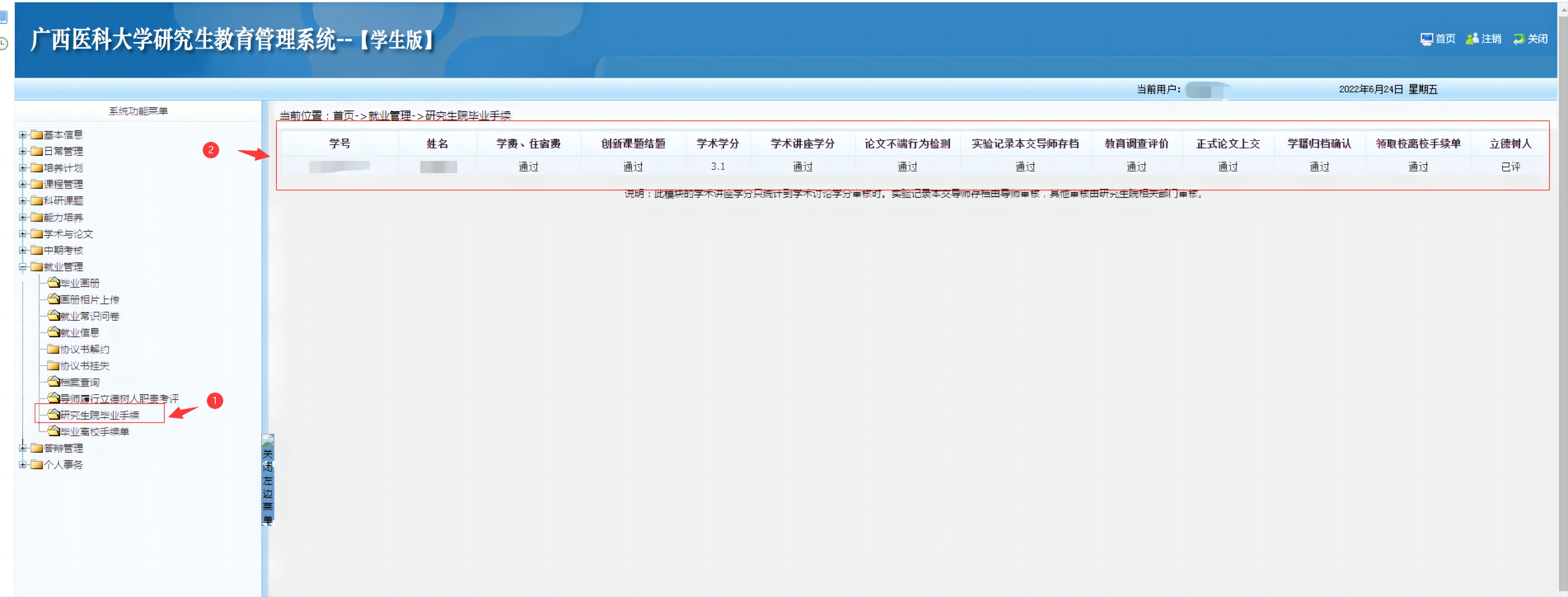 “毕业手续单(即红单)”查看路径:登录本人“研究生教育管理管理系统”,点选“就业管理”—“研究生院毕业手续”,所有毕业手续均显示“通过”(见图1)后“毕业生离校系统”中【红单办理】显示“已办理”,未完成者请携带相应项目需要的材料到相关部门进行审核。全日制研究生及在职博士【红单办理】完成后约需30分钟才能显示。