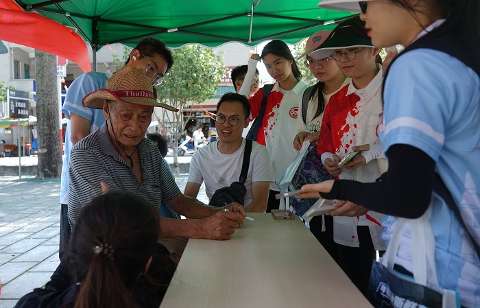7月17日上午,实践团走进韦拔群的故乡——东兰县武篆镇。在被誉为“革命楼”和“文明楼”的魁星楼旁,实践团成员们顺利开展了爱心义诊活动。活动现场前来咨询和义诊的乡民们络绎不绝,气氛融洽。同学们主动热情地为群众测量血压、放松按摩和操作艾灸,讲解健康保健与急救知识,并向老人家们宣传老年人膳食指南。宣讲组成员通过演示海姆立克急救法和心肺复苏急救技能,同时邀请现场群众互动体验,将科学急救及健康知识在人民群众中传播开来。爱心义诊活动展示了医大学子良好的精神面貌,得到了当地群众的高度肯定。