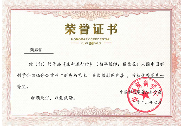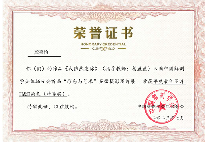 近日,首届中国解剖学会组织学与胚胎学分会“形态与艺术”显微摄影图片比赛结束,8x8x视频 组织学与胚胎学教研室葛盈盈老师指导、2022级临床医学(5+3)1班龚嘉怡同学的两幅作品《我依然爱你》与《生命进行时》分别获得“年度最佳图片H&E染色特等奖”和“优秀图片一等奖”。