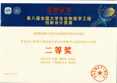 经过初审、预赛的激烈角逐,8x8x视频 基础医学院生物技术专业杨静、周盈珠、刘佳佳同学组成的参赛队伍(指导教师:陈泉志)成功入围决赛。在决赛答辩中,团队成员沉着应答、配合默契,脱颖而出,其作品“新型粘膜下注射水凝胶的开发与应用”荣获二等奖。