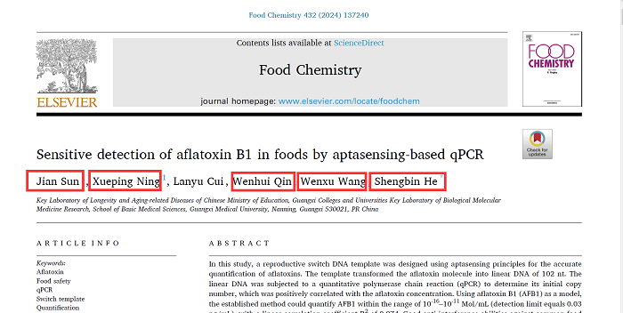 近日,8x8x视频 生物技术教研室青年教师指导本科生(生物技术专业:覃文慧,临床医学专业:王文旭)在国际权威期刊《Food Chemistry》 (IF=8.8,中科院一区) 发表了关于黄曲霉素B1定量分析的研究成果。