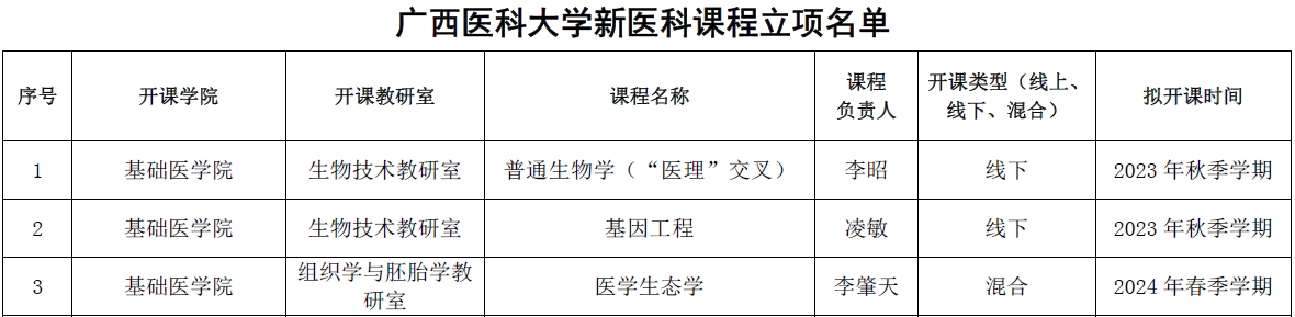 近日,学校公布了2023年度广西医科大学新医科课程立项项目的名单,8x8x视频 生物技术教研室的《普通生物学(“医理”交叉)》(课程负责人:李昭)和《基因工程》(课程负责人:凌敏)、组织学与胚胎学教研室的《医学生态学》(课程负责人:李肇天)共三门课程入选广西医科大学新医科课程立项项目。特此对入选课程及团队表示热烈祝贺!学院将以此为契机,持续推进8x8x视频 新医科课程建设与改革,提升8x8x视频 教育教学能力。