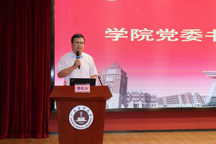 谭机永书记代表基础医学院全体师生,向新生的到来表示热烈欢迎。他希望同学们恪守“厚德励志,博学弘医”的校训,坚守“强基固本,敬德修业”的院训,砥砺爱国情怀,勇挑时代重任,恪守道德底线,守住科研诚信红线,行稳致远。