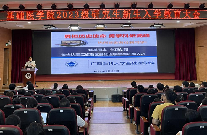 谭国鹤院长“以勇担历史使命,勇攀科研高峰”为主题为新生讲授开学第一课。他寄语新生们要知感恩、葆进取、常自省、持勤奋、踏实干,夯实基础、守正创新,争做边疆民族地区基础医学卓越创新人才。